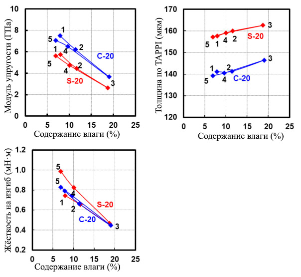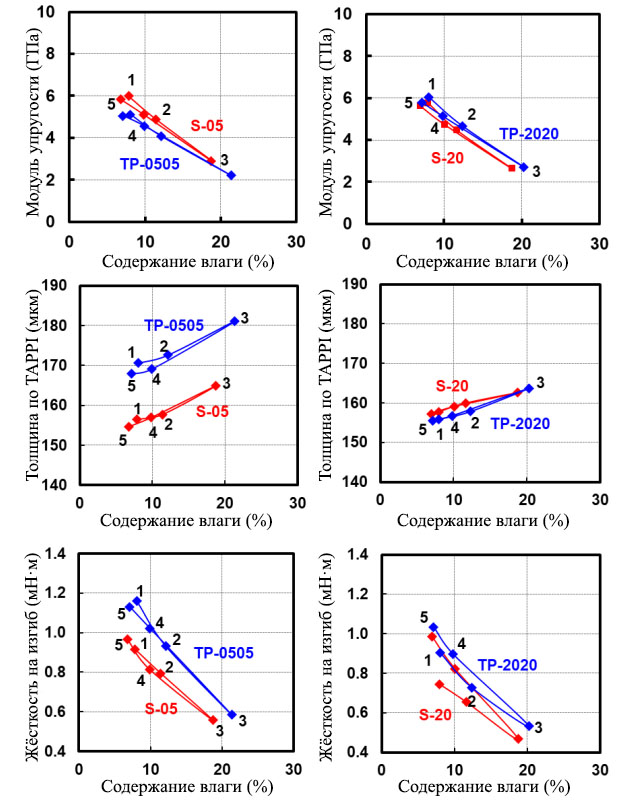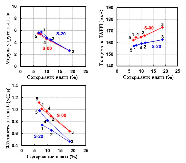 Рис. 1. Модуль упругости, толщина и жёсткость на изгиб однослойных лабораторных листов, содержащих 0% (красный цвет, S-00) и 20% (синий цвет, S-20) мелких фракций, в зависимости от содержания влаги.