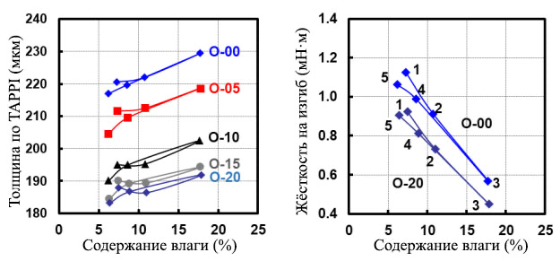 Рис. 4. Толщина листов из OCC с различным содержанием мелких волокон и жесткость при изгибе листов из OCC с содержанием мелких волокон 0% и 20%.